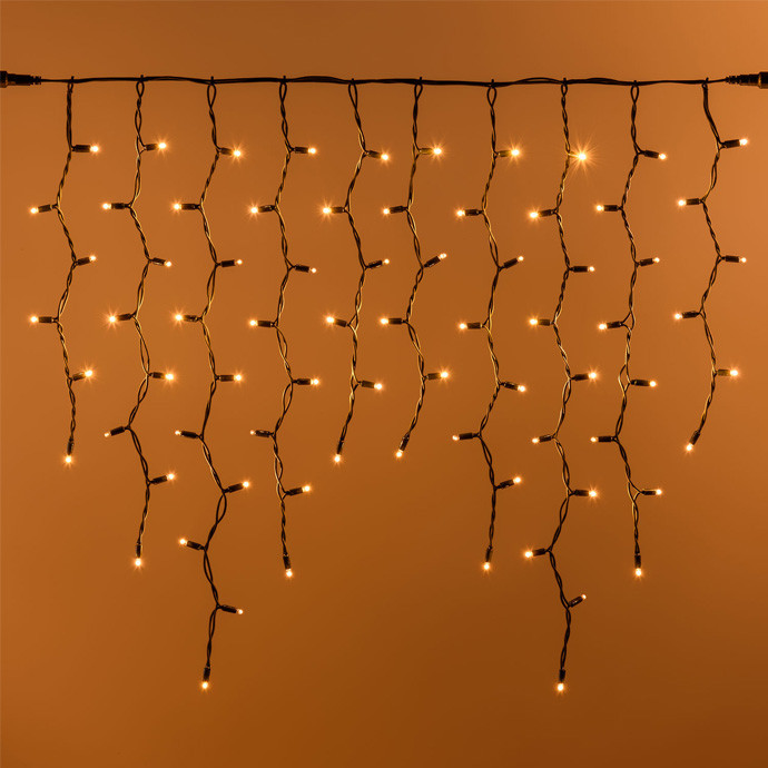 Virtene ir 5 m gara un sastāv no 150 LED spuldzītēm, kas izvietotas 10 cm attālumā viena no otras. Izvietojums. Lāsteku garums ir no 30 - 40 - 50 cm.