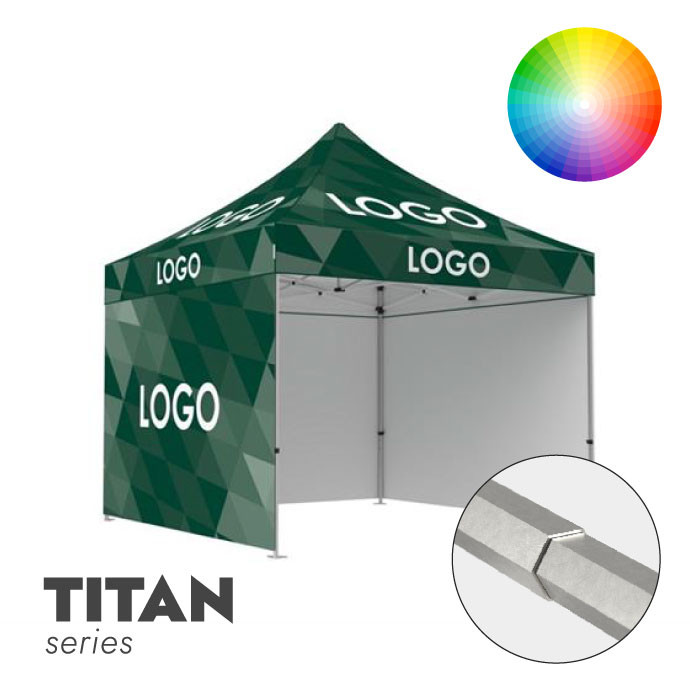 Tas ir augstākās kvalitātes risinājums, kur reklāmas dizains tiek drukāts tieši uz auduma vēl pirms telts tiek sašūta. Tādējādi var iegūt jebkādus grafiskos elementus – logotipus, fotogrāfijas, rakstus vai citus dizainus bez jebkādiem ierobežojumiem. Drukas iespējas ir pilnīgi neierobežotas - var drukāt uz jumta, sienām vai pat uz visas telts virsmas. Pēc drukas audums tiek profesionāli sašūts, nodrošinot augstu estētiku un izturību pret laikapstākļiem. Tas ir ideāls risinājums uzņēmumiem, kas vēlas radīt unikālu un profesionālu tēlu pasākumos, izstādēs vai āra tirdzniecībā. TITAN klases tirdzniecības teltis ir vispopulārākās atveramās teltis alumīnija 3x3 izmēra kategorijā. Tās ir radītas profesionālai un biežai lietošanai jebkādos laikapstākļos. Teltis ir izgatavotas no īpaši izturīgiem un kvalitatīviem materiāliem.